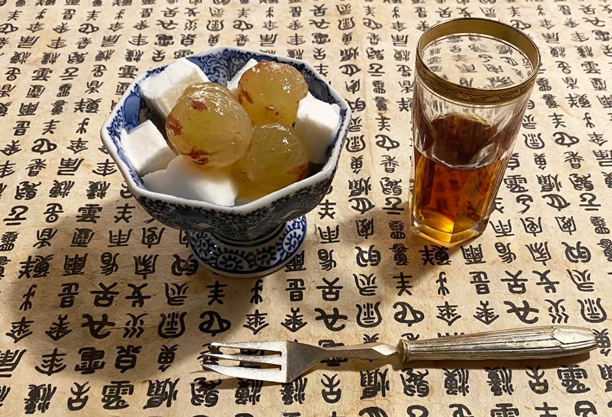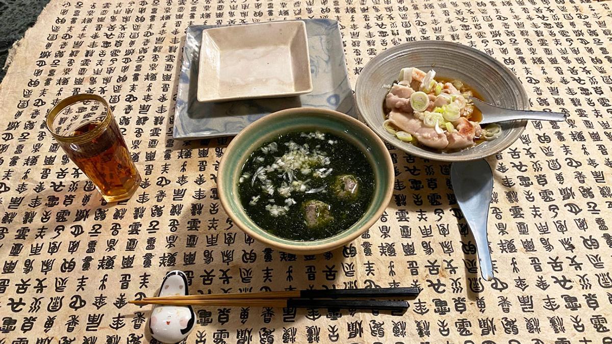 鮭の白子の蒸し焼き(ポン酢醤油をかける)、イワシのつみれ入りの生青海苔スープ(中華風味)。
