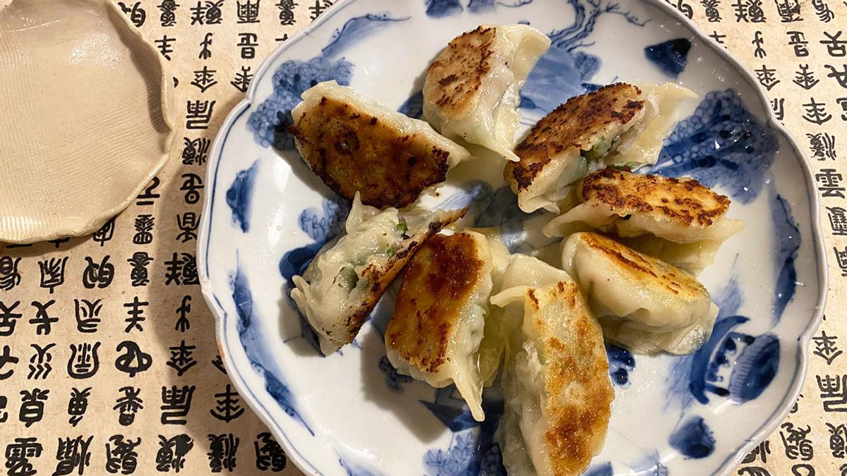 焼き餃子(豚肉、白菜、生姜、ネギ、ニラ)。ただいま我が家の庭に、ニラがぐんぐん育っています。