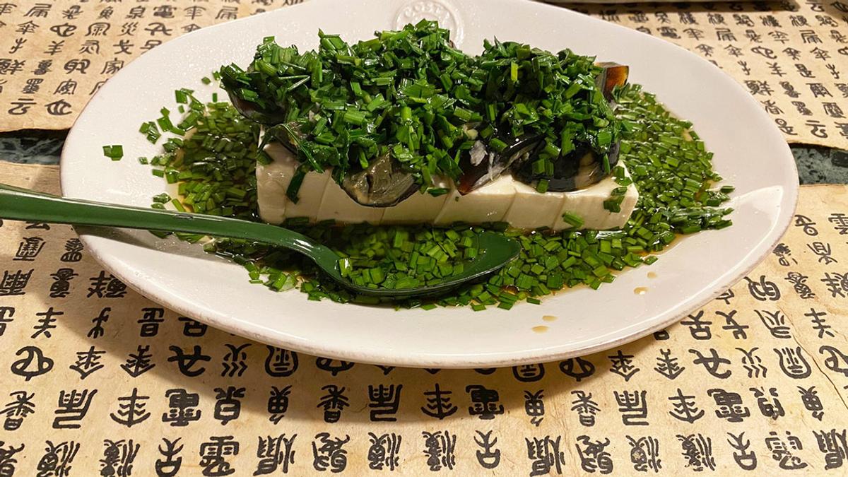 豆腐+ピータン+ニラ(ポン酢醤油で味付けしておく)+熱々のゴマ油をジュワッと。