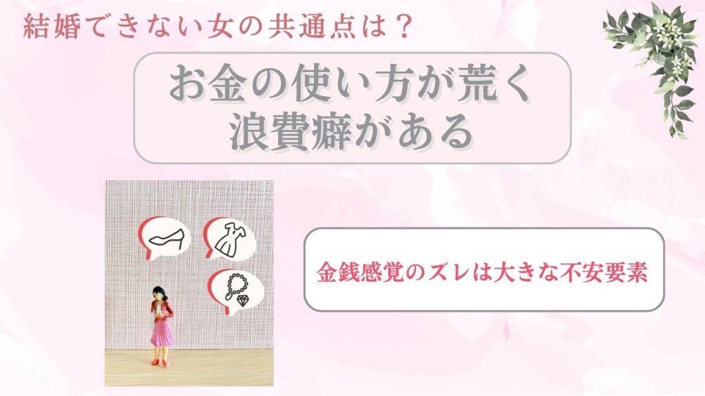 お金の使い方が荒く浪費癖がある場合、将来設計が見えにくいため結婚相手として敬遠されがちです。