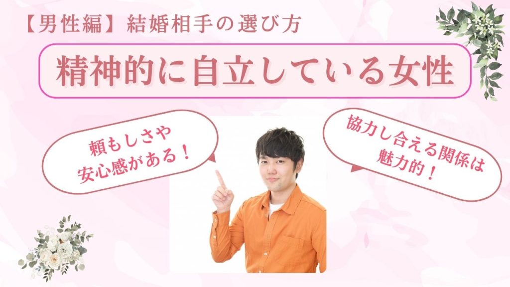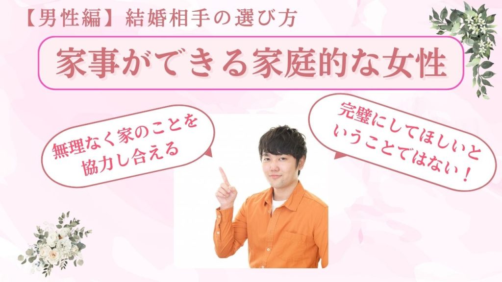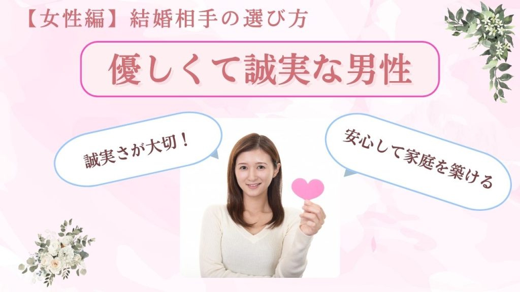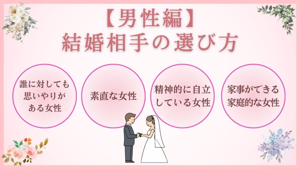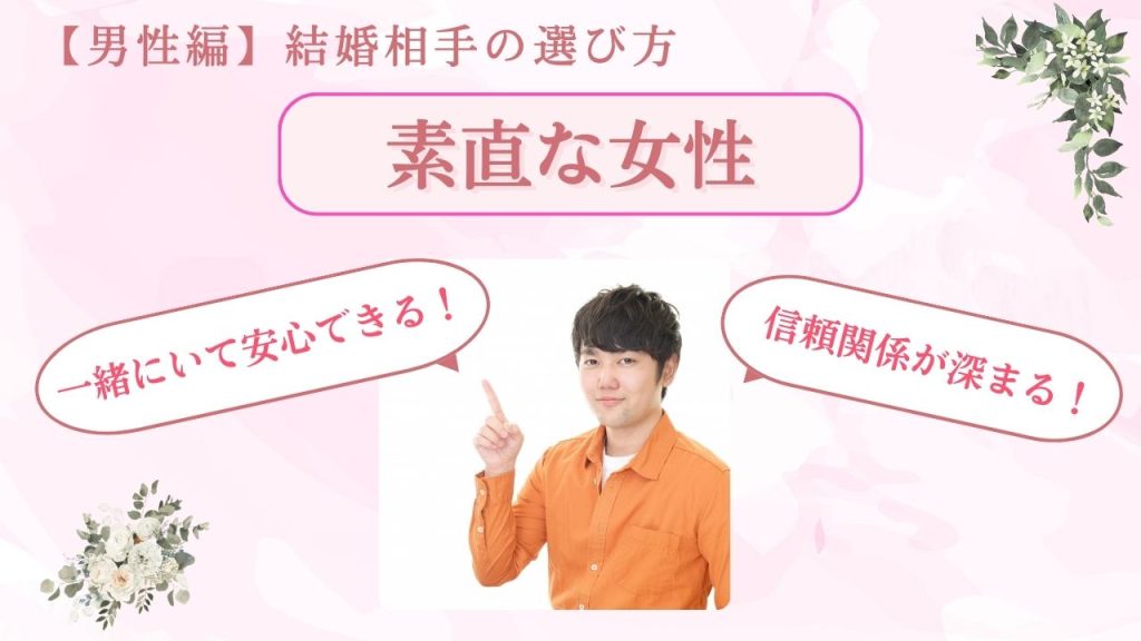 男性が結婚相手を選ぶ際は、長い人生を共に歩むうえで安心して関係を築けるかを重視します。