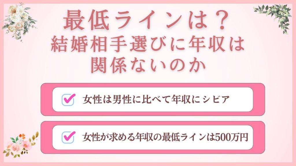 一般的に、女性が結婚相手に求める年収は「500万円程度」が一つの目安とされています。
