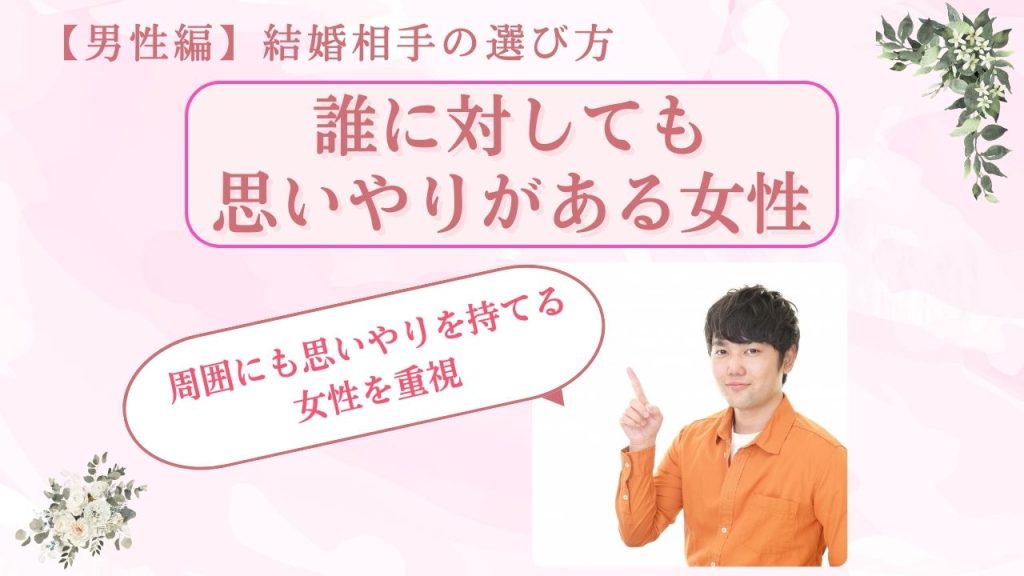 男性は、パートナーが自分だけでなく周囲にも思いやりを持てるかを重視します。