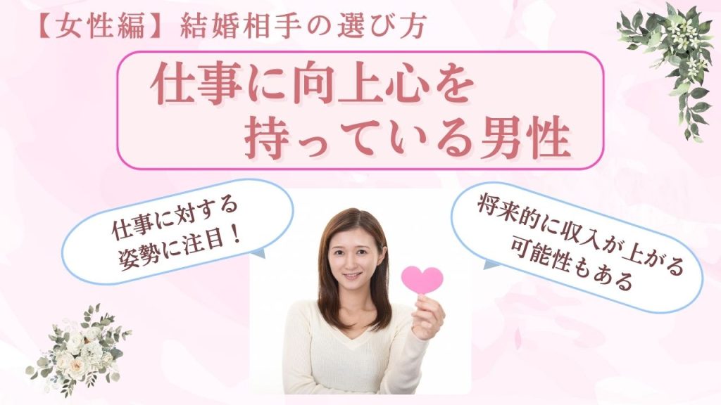 向上心を持って働く男性は、将来的に収入が上がる可能性もあり、家庭の安定につながると考えられているからです。