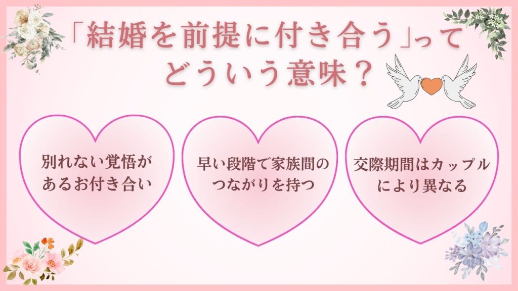 今回は、結婚を前提に付き合う、とはどういう意味なのか解説しました。