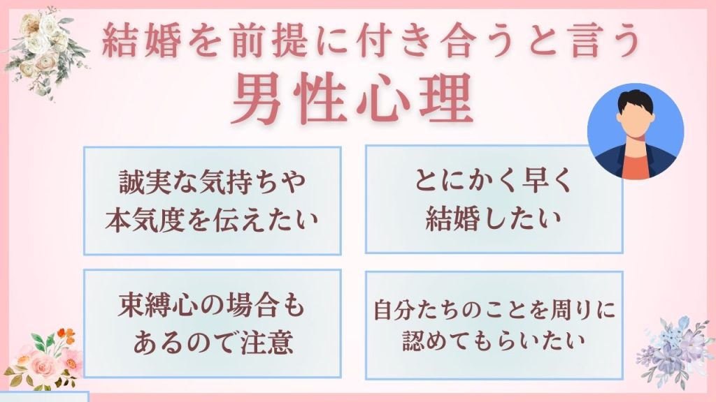 本項目では、結婚を前提に付き合うという男性の心理を4つのパターンに分けて解説します。