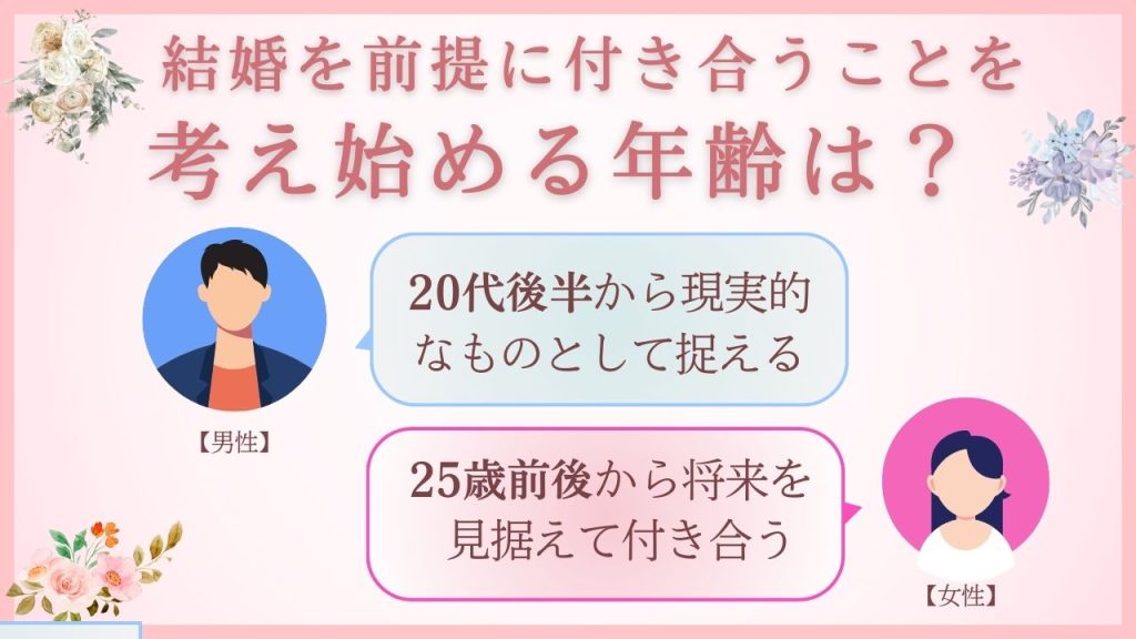 男性は、社会人としての経験を積み、仕事が安定してきたタイミングの20代後半から結婚を現実的なものとして捉える傾向が強まります。