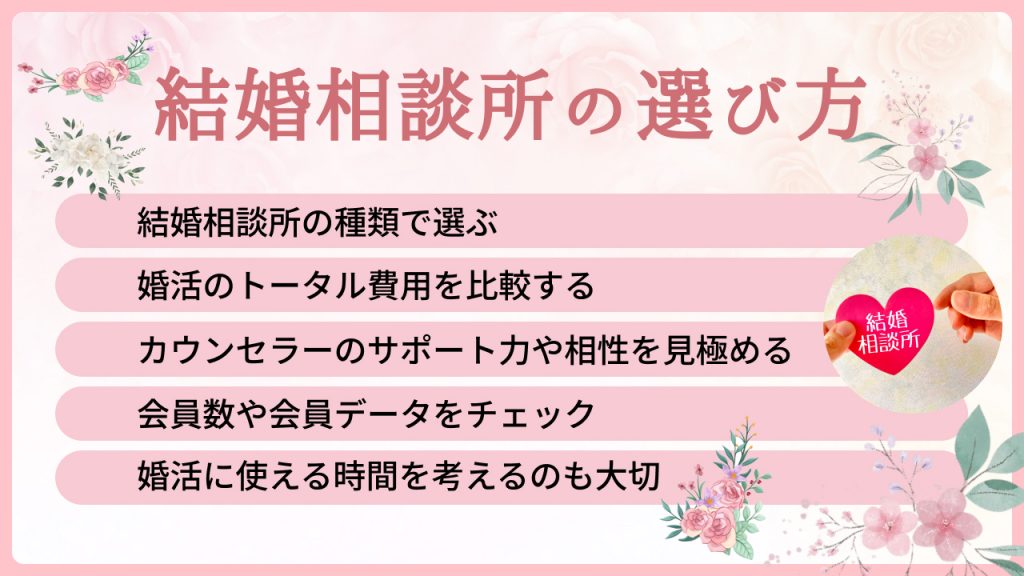 結婚相談所を選ぶ際は、相談所の種類やサービス内容、費用やサポート体制など総合的に比較することが重要です。