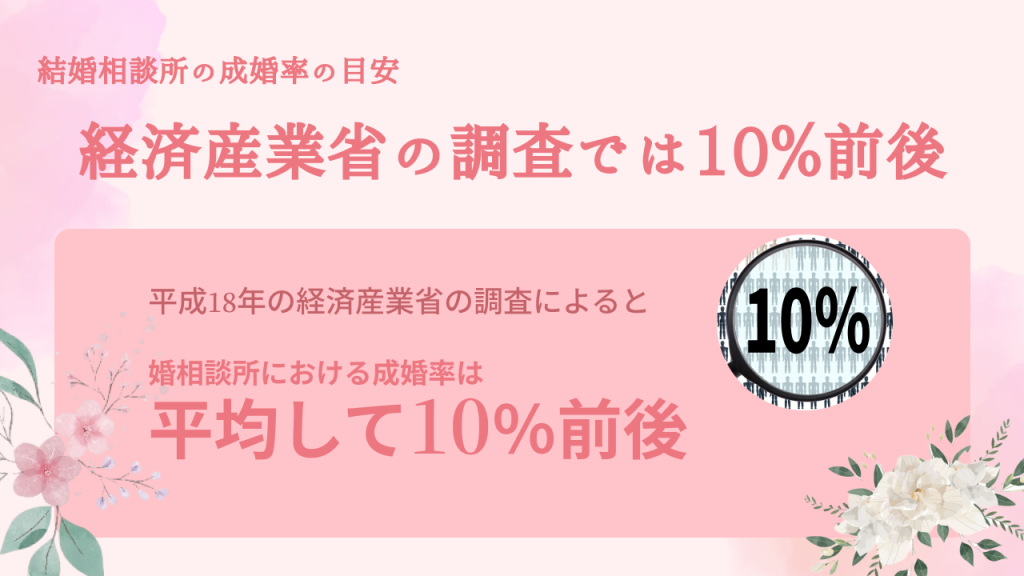 平成18年の経済産業省の調査によると、結婚相談所における成婚率は、平均して10%前後であるというデータが発表されています。