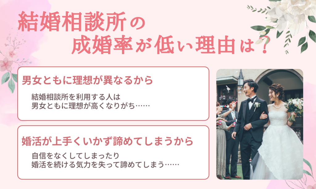 成婚率が低い理由は、お相手に対する理想像や婚活が上手くいかないことが影響しています。