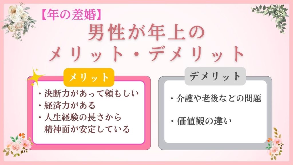 こちらの章では、年上の男性と年の差婚をするメリットとデメリットについて詳しく紹介します。