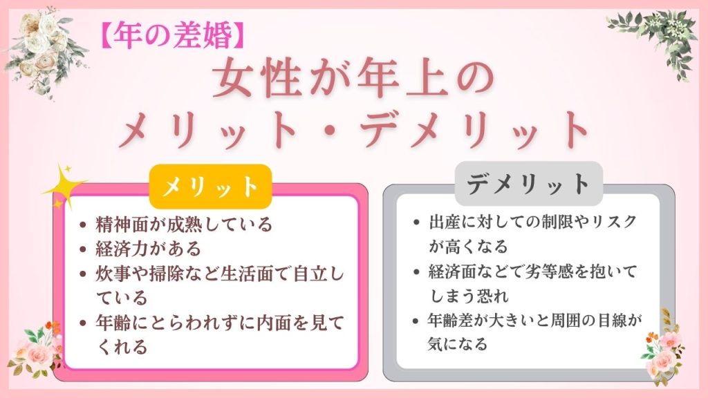 こちらの章では、女性が年上の年の差婚のメリットとデメリットについてお伝えします。