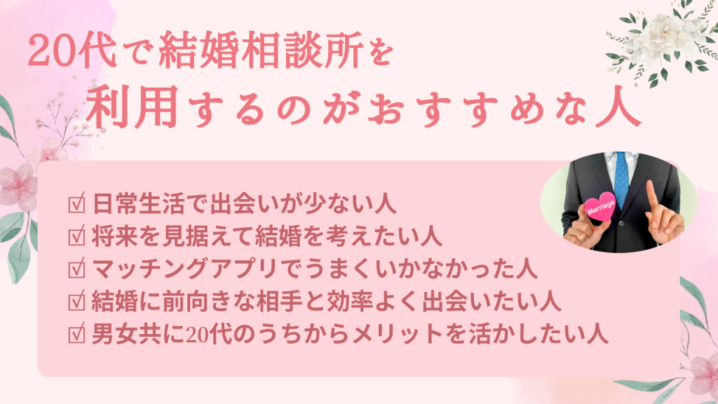 しかし、近年では価値観の変化により、20代のうちから結婚を真剣に考え、効率的な出会いを求めて相談所を利用する人が増えています。