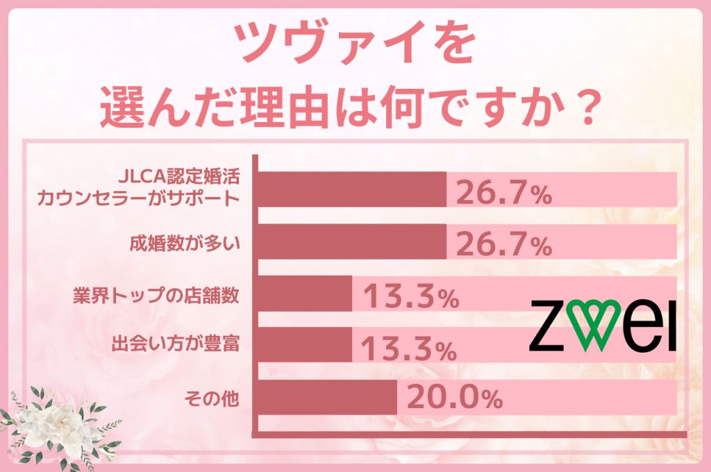 ツヴァイを選んだ理由のアンケートを実施したところ、「JLCA認定婚活カウンセラーがサポートしてくれるから」「成婚数が多いから」が15名中それぞれ4名で最多の回答となりました。