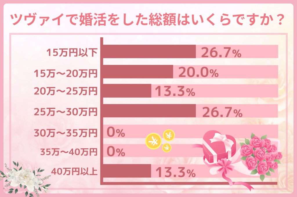 ツヴァイで婚活をした総額のアンケートでは、「15万円以下」「25万~30万円」の回答が15名中それぞれ4名で最多でした。