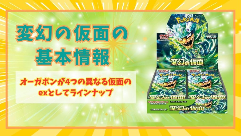最大の特徴は、伝説のポケモン、オーガポンが4つの異なる仮面のexとしてラインナップされていること。