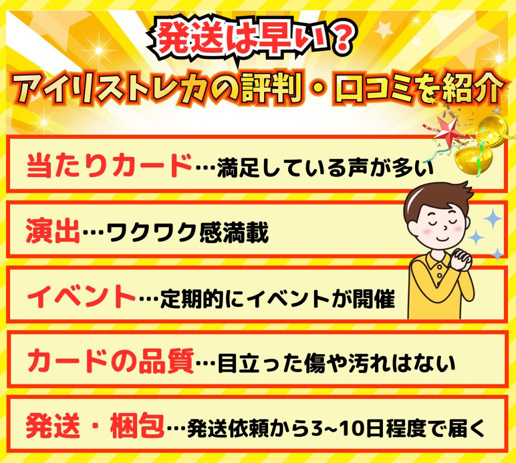 実際にアイリストレカを利用した方の口コミでも、当たりカードの出やすさや演出のワクワク感、カードの品質について高く評価している声が多くありました。