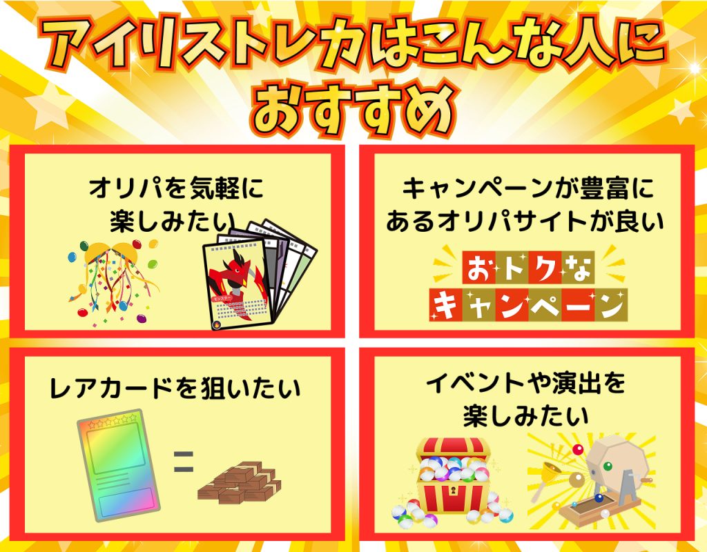 アイリストレカは、少額から引けるオリパや豊富なキャンペーンなど初心者でも安心して始めやすい仕組みが整っています。