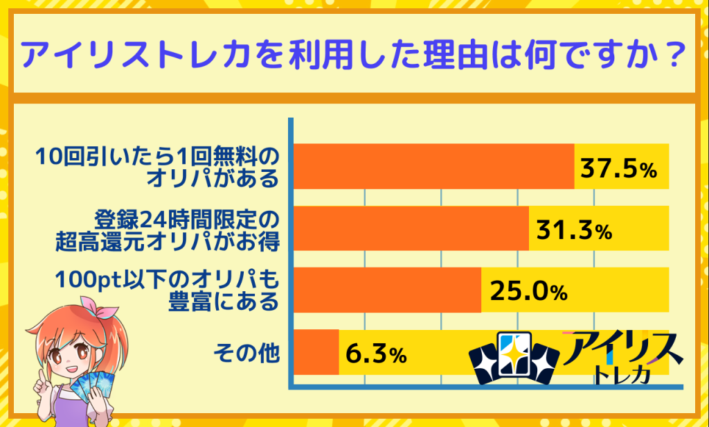 アイリストレカを利用した理由についてアンケートを実施したところ、「10回引いたら1回無料のオリパがあるから」が16名中6名で最多の回答となりました。