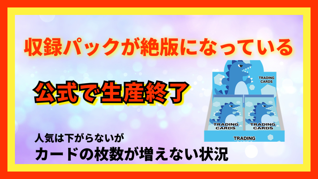 現在は新品BOXを正規ルートでは入手できず、市場に流通しているカードの枚数が増えない状況です。