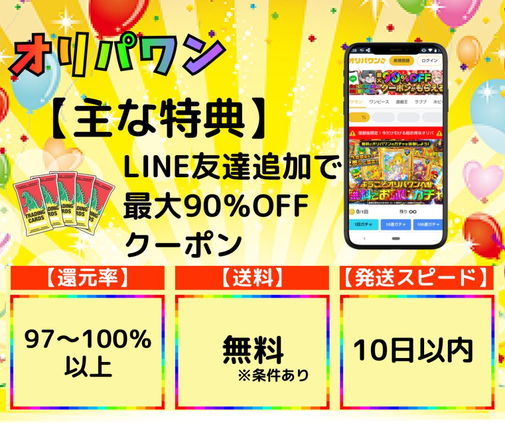 | 特典 | 公式LINE追加で最大10,000コイン 友だち紹介で無料オリパ・最大300マイル | LINE連携で最大70%OFFクーポン | 新規限定で最大90%OFF | LINE友達追加で最大90%OFFクーポン | 公式LINE連携で割引クーポン 登録後24時間限定オリパあり | 初めて引く方限定500pt 初回購入限定最大90%オフクーポン |