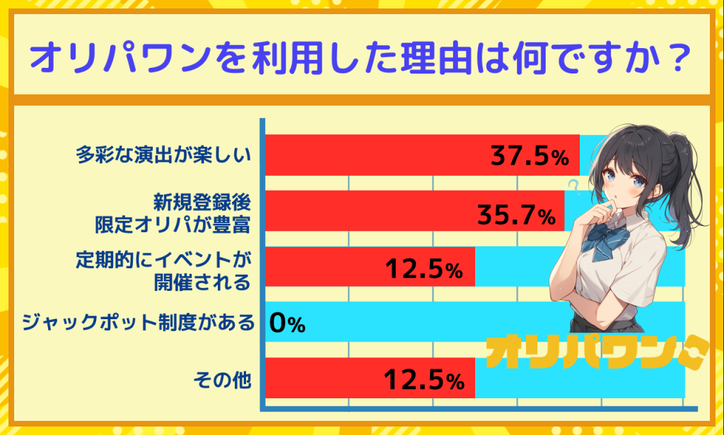 オリパワンを選んだ理由のアンケートを実施したところ、「多彩な演出が楽しいから」「新規登録後限定オリパが豊富だから」が8名中それぞれ3名で最多の回答でした。