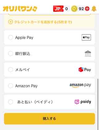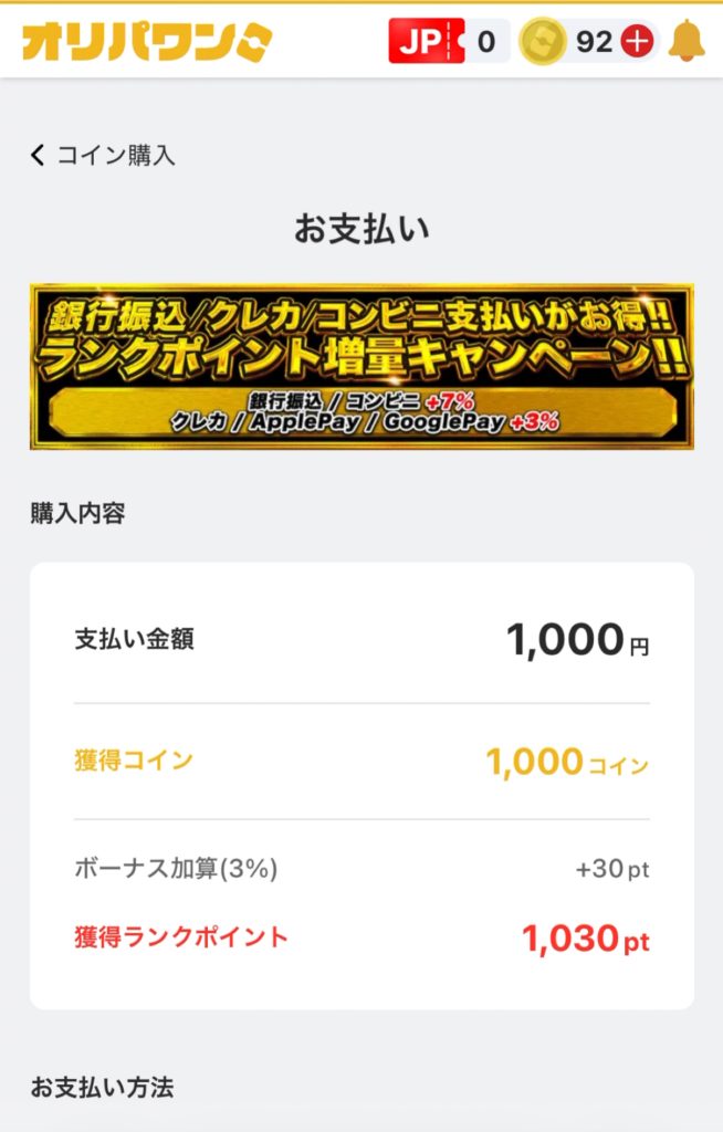 支払い方法が豊富なため、クレジットカードを持っていないユーザーやコンビニ支払いを好むユーザーでも利用しやすい点がオリパワンの強みです。