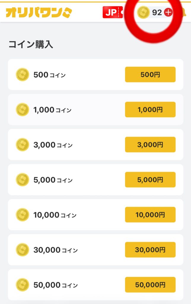 オリパワンのコインは、常に「1コイン=1円」 で購入できます。