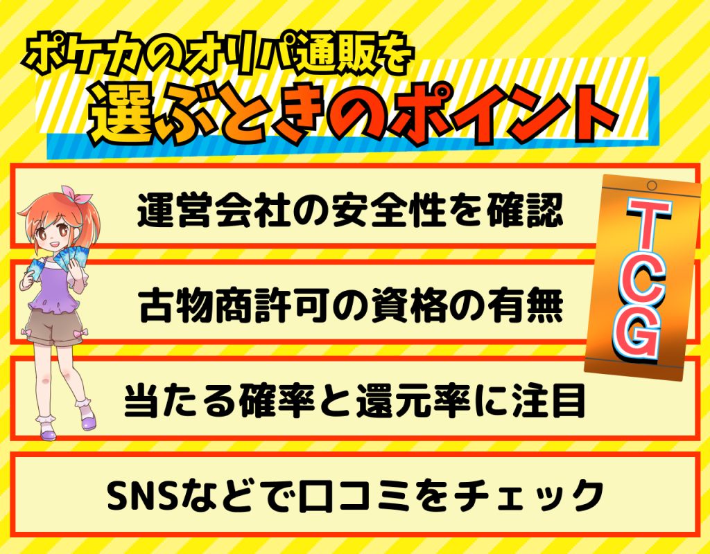 ポケカのオリパ通販は、運営の信頼性や利用しやすさだけでなく、特典や還元率、口コミなどもチェックして自分に合うサイトを選ぶのがポイントです。
