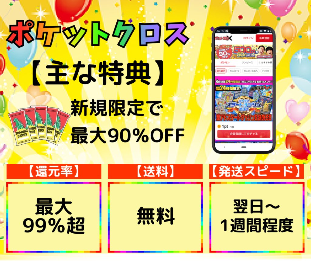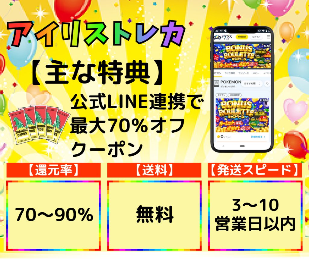 | 特典 | 公式LINE追加で最大10,000コイン 友だち紹介で無料オリパ・最大300マイル | LINE連携で最大70%OFFクーポン | 新規限定で最大90%OFF | LINE友達追加で最大90%OFFクーポン | 公式LINE連携で割引クーポン 登録後24時間限定オリパあり | 初めて引く方限定500pt 初回購入限定最大90%オフクーポン |