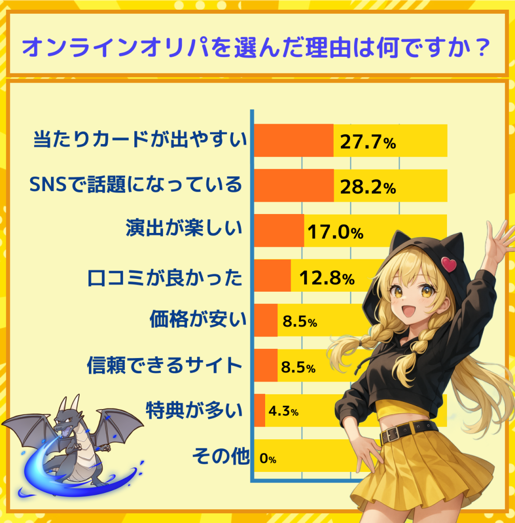 実際に利用したオンラインオリパを選んだ理由についてのアンケートでは、「当たりカードが出やすいから」が47名中13名と全体の25%以上を占めました。